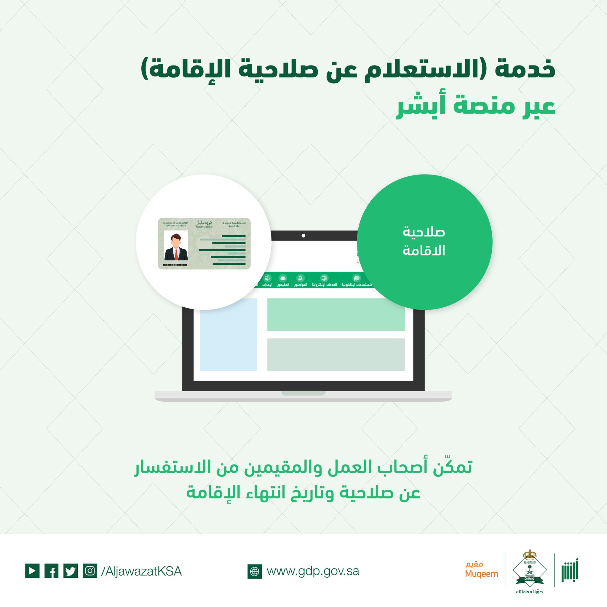الجوازات السعودية Pa Twitter خدمة الاستعلام عن صلاحية الإقامة تتيح لأصحاب العمل والمقيمين من الاستفسار عن صلاحية وتاريخ انتهاء الإقامة بشكل إلكتروني عبر منصة أبشر Https T Co Z9ilssdwxn Https T Co Dchhfdc7hq